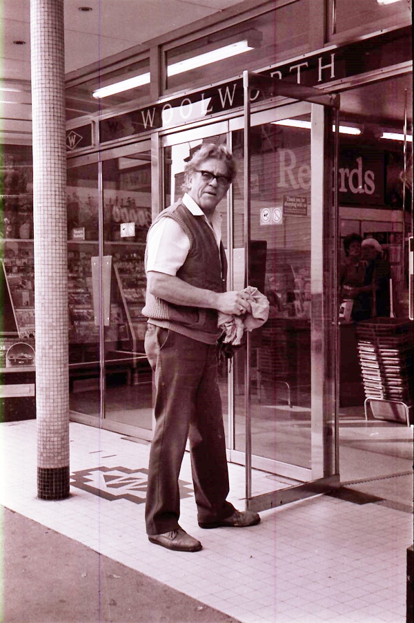 (C191) Man cleaning the glass door at the entrance to Woolworths.