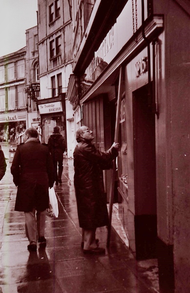 (A198) Opening shop shutters at Chilcotts, Wicker Hill. Trowbridge Book Shop in the background