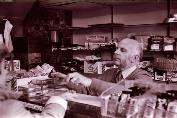 A206 This is Mr Wilkins in his shop ‘The Dinkie’ Wicker Hill. A wonderful old fashioned sweet shop & popular with many people left [Stephen Lovering]